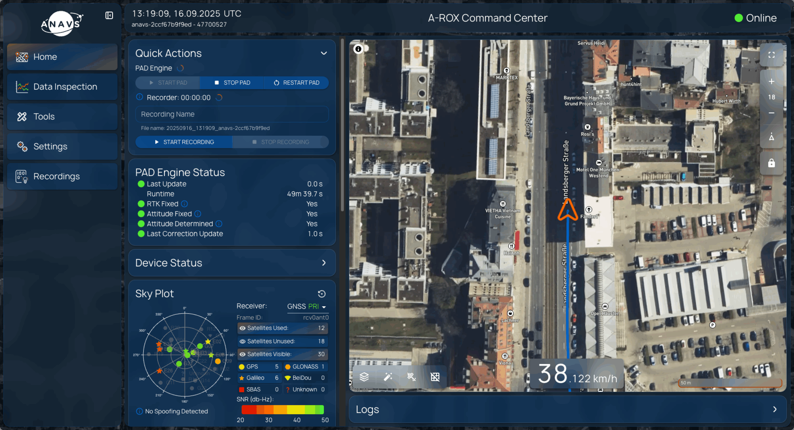 The A-ROX version supports Galileo High Accuracy Service (HAS) service (both via SIS and IDD) and OSNMA for navigation data accuracy. The A-ROX system comes with a ROS2 software architecture, which leads to access to all sensor raw data and solution outputs with ROS2 topics. This software architecture makes it very powerful for an easy integration in other toolchains and subsystems.