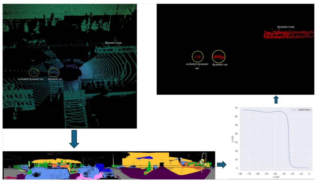 Downsampling using voxel grids (Rusu and Cousins, 2011) reduces the size of the pointclouds, but at the cost of spatial resolution. To mitigate this trade-off, we mimic downsampling by first semantically segmenting the pointclouds as shown in Figure 2 (bottom left), and only select points likely to be dynamic, such as cars, bicycles, trucks, pedestrians, and motorcycles, while discarding points that are truly static such as buildings, roads, sidewalks, traffic signs, and vegetation. This approach reduces the number of points while preserving the geometry of all objects in the scene. To maintain real-time capability, we optimize the model (Reichert et al., 2025) using TensorRT, achieving a mean IoU of 55.6 % with a processing time of approximately 12 ms.