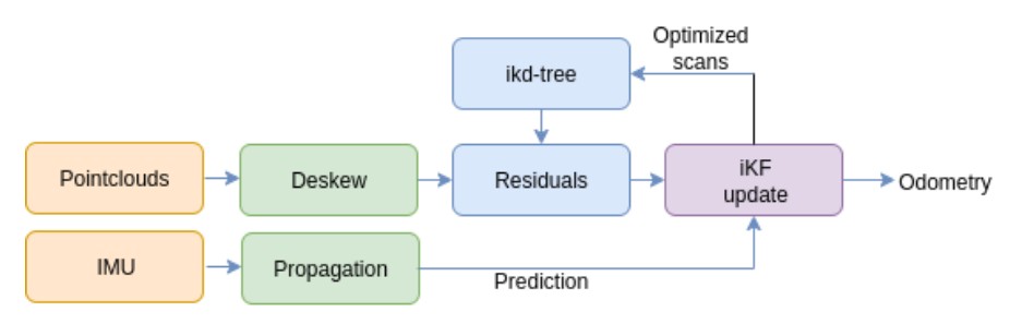 distances are used as the update step for the iKF, which, upon converging, generates the odometry. The de-skewed pointcloud is then transformed and inserted into the ikd-tree to extend the local map.