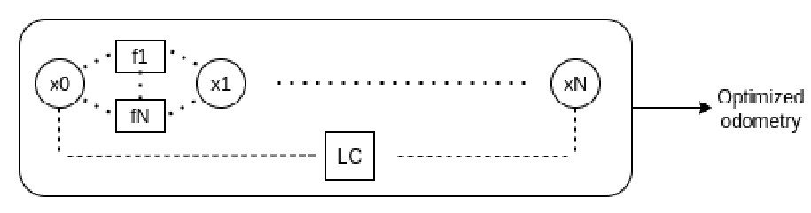 In the backend, we employ a factor graph optimization framework to refine the odometry estimates generated by the frontend. Figure 5 illustrates the fundamental structure of the factor graph approach. The graph consists of variable nodes (x0 − xN ) representing the system states to be optimized, including robot poses, velocities, and IMU biases. Factors (f 1 − f N , LC) encode probabilistic constraints between state variables. These factors encompass various measurement modalities: between-factors representing relative pose constraints, loop closure detections (LC), wheel odometry measurements, GPS observations, landmark associations, and IMU pre-integration terms. An IMU prior factor is used to initialize the graph. Each factor imposes constraints to ensure consistency with the observed measurements.