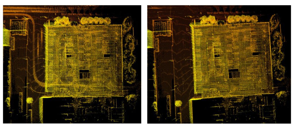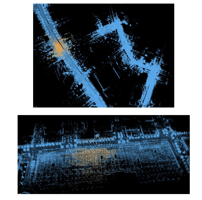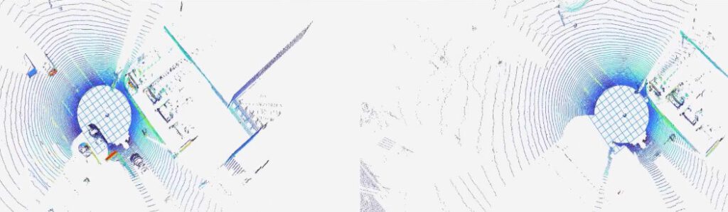 Figure 3 shows a side-by-side comparison of the raw pointcloud (left) and the cleaned pointcloud (right) in an urban scenario, where the LiDAR-equipped vehicle is slowly moving at a signal along with surrounding cars. In the cleaned pointcloud, all dynamic cars have been removed, leaving only static points such as containers, buildings, and vegetation.