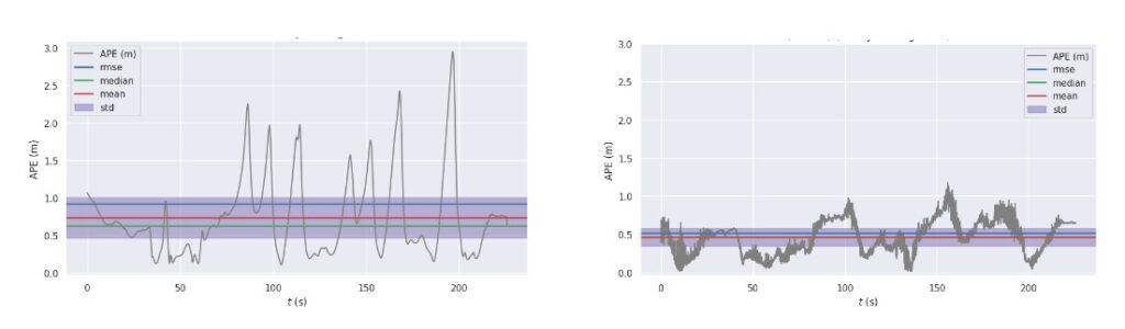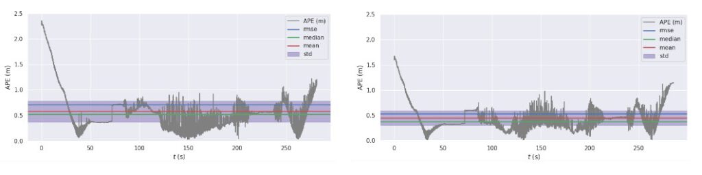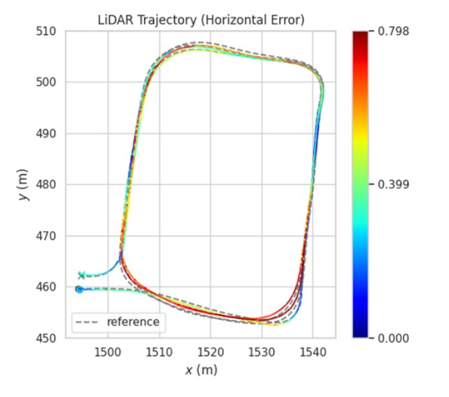 Figure 8 shows the horizontal error of the LiDAR-Inertial Odometry (LIO) benchmarked against the ground truth. The ground truth was generated using an GNSS/IMU fusion approach with RTK corrections and a high-grade IMU, refined using Rauch–Tung–Striebel smoother to obtain accurate and reliable reference trajectories. We benchmarked two variants of LIO: one using raw, unprocessed pointclouds directly from the sensor, which resulted in an RMSE of approximately 0.7 m, and another using cleaned pointclouds with dynamic objects removed, which achieved an RMSE of approximately 0.5 m. The result plots clearly demonstrate that dynamic object removal improves LIO accuracy, yielding an average reduction in RMSE of about 20 cm.