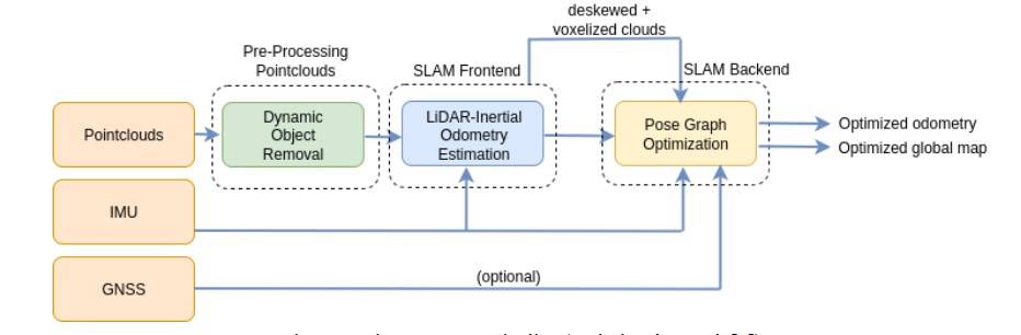 The LiDAR SLAM architecture presented here is a tightly coupled frontend-backend system with a pointcloud preprocessing stage. The frontend is FAST-LIO2, where LiDAR pointclouds and IMU measurements from a high resolution LiDAR are tightly integrated to estimate odometry. The estimated odometry is further optimized in a factor graph-based backend. An IMU prior factor is used for initialization, while relative poses and loop closures serve as between factors in the optimization. The de-skewed pointclouds are transformed using the optimized poses and subsequently stitched together to produce a globally consistent map. The factor graph backend can optionally incorporate GNSS factors to align the trajectory to a global frame. In this work, we omit GNSS integration to highlight the robustness of our SLAM pipeline in GNSS-denied environments