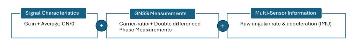 IMU measurements: Informations from other non-GNSS sensors such as IMU measurements serve as a strong source for cross-checking. The features are not affected by GNSS interference and provide information about changes in the dynamics. Thus, the measurements are complementing the information about DD measurements and the CR when reacting to dynamics.