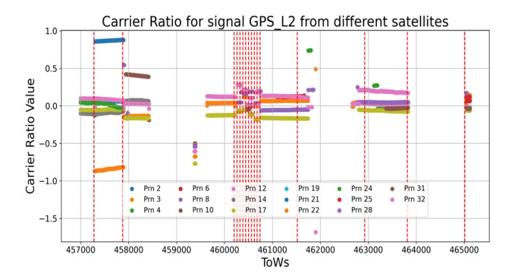 Cross-band ratio of phase measurements: The ratio between carrier phase measurements from signals transmitted by the same satellite in different bands should be relatively constant. Ionospheric delays are one source that lead to changes of the carrier ratio (CR) over time but the dynamics of these changes are very moderate compared to the reaction of the GNSS receiver under interference. Hence, clear carrier-phase divergence is an indicator of GNSS interference.