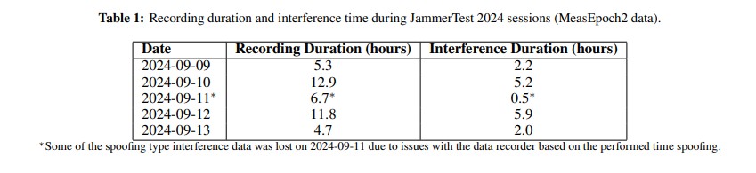 The datasets comprise measurements collected over five days. Table 1 summarizes the total recording duration per day, as well as the duration of interference observed during the recordings.