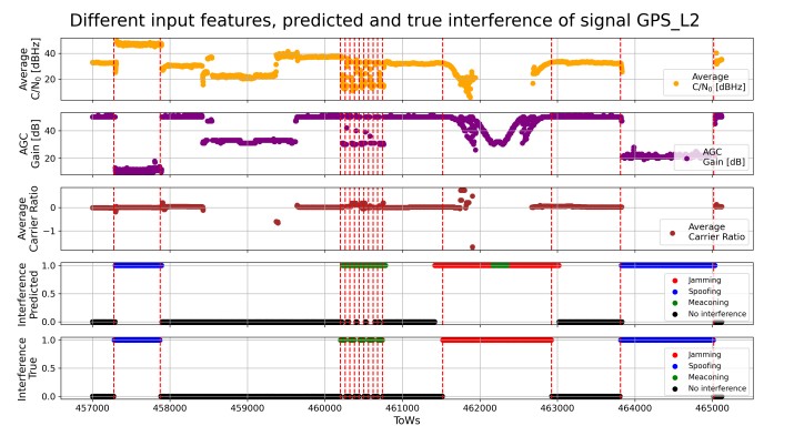 importance of carefully labeled transitions in spoofing, jamming, and meaconing datasets to ensure that the network can rapidly detect interference events, supporting timely downstream processing. Figure 6 shows a corresponding jamming example. Here, the C/N0 values drop significantly, as expected for jamming scenarios. This reflects the physical mechanism of jamming, where wide-band interference reduces the effective signal-to-noise ratio, impairing lock maintenance in the receiver. The model predictions align closely with the ground truth, demonstrating its ability to recognize such characteristic patterns. Several delays in the reaction of the receiver are also due to slightly increasing power ramps or due to sweeps, both resulting in different times where the receiver is affected. This demonstrates the need for further research to increase the classification performance by updating the labeling based on the specifics of interference test cases.