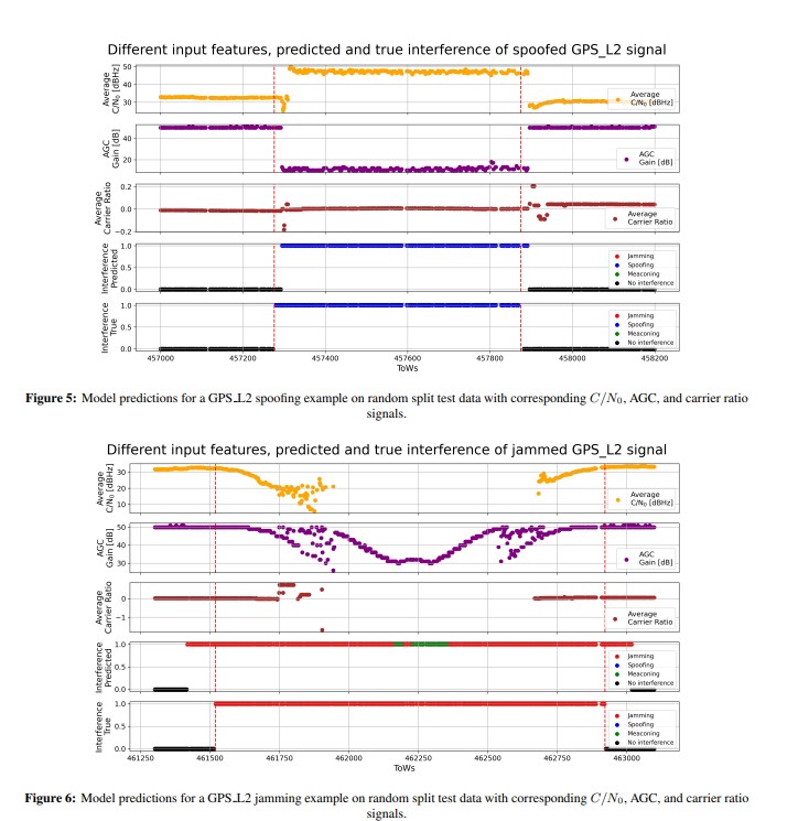 Moreover, we could highlight challenges that arise due to the nature of different interference types such as power ramps and sweeps in jamming scenarios. The latency of the receiver when reacting to the interference affects the labeling and thus, the training process. This will be investigated in future research. Additional future work includes the analysis focusing more on dynamic data and the associated challenges to know when a label should be changed because of occlusion from the jammer or spoofer due to buildings or other parts of the environment. Ultimately, comparisons on accuracy, availability and more metrics of the positioning algorithm when making use of the detection scheme are also planned.