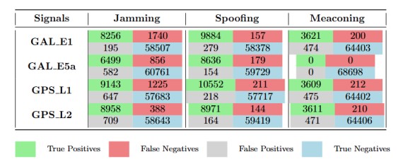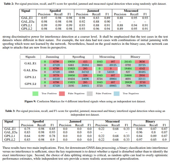 Using the random train and test data split, the model achieves precision and recall values exceeding 0.9 across the various GNSS signals and interference types, as summarized in Table 2 for representative signals including GAL E1, GAL E5a, GPS L1, and GPS L2. These results demonstrate that the network can reliably distinguish between no interference, spoofing, jamming, and meaconing for different GNSS signals when the training and test distributions are highly similar.
