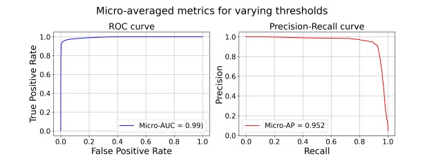 Nonetheless, the presented deep learning approach already classifies interference efficiently not only in specific scenarios but also in general, which is depicted in Fig. 8 where the micro metrics are shown, which combine all labels. The area under curve (AUC) for the receiver operating curve (ROC) of 0.99 and the high precision and recall values (Micro-AP = 0.952) show the effective identification of interfered signals.