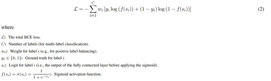 The Binary Cross-Entropy (BCE) loss function (2) combined with a Sigmoid activation function is used in this work. Unlike categorical cross-entropy loss, the loss computed for probability of each output label is not affected by probability values for other labels. Hence it is widely used for multi-label classification, where the probability and decision making of an input sample belonging to a certain label should not influence the decision for another label.