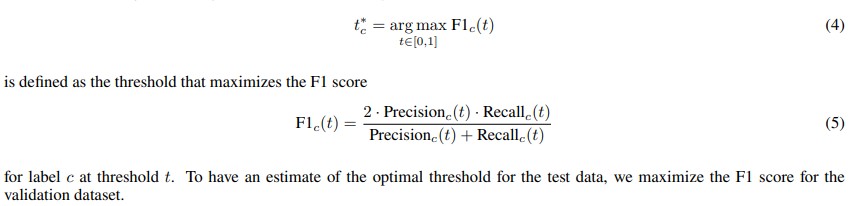 Dataset imbalance with some labels appearing more frequently than others can affect the prediction metrics. So, the decisionmaking thresholds for each sigmoid output to classify a sample as belonging to one or more labels are selected based on maximizing the F1 score on validation data, thus ensuring a balance between precision and recall for the multi-label classification problem. This design allows the model to simultaneously detect multiple types of interference across all GNSS signals, leveraging both the inter-signal features and their temporal evolution. For each label c ∈ {1, 2, . . . , C}, the optimal threshold t∗c