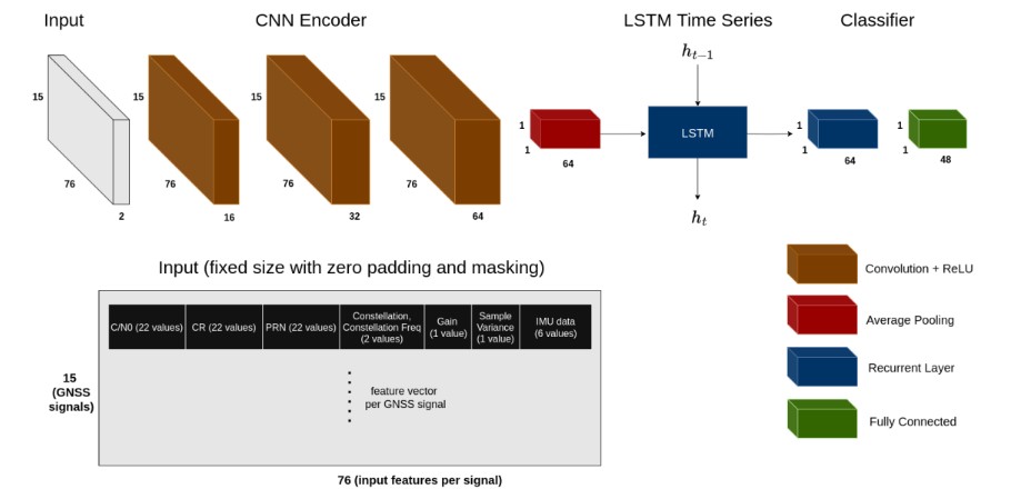 We propose a CNN-LSTM framework shown in Figure 3 to detect GNSS interference, including spoofing, jamming, and meaconing attacks. The input to the network is a matrix of size Ns × Nm × 2, where Ns is the number of GNSS signals and Nm is the number of measurements per signal. Each row corresponds to a single GNSS signal and contains the following features: C/N0, CR, PRN, constellation identifier, frequency, AGC, sample variance, and IMU data. Note that IMU samples are available at a higher rate than GNSS and all measurements since the last GNSS epoch are filled into the rows of the signals even if unrelated to the signals themselves. Further note that the PRN, the constellation identifier, and the frequency are provided