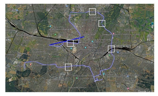 In Fig. 8, which refers to the blue trajectory plotted in Fig. 6, another trajectory result is shown. It is generated by the 2D LiDAR SLAM. The trajectory shows a smooth path of the tracked motion both indoor and outdoor, as well as across the indoor-outdoor transition. Furthermore, the trajectories of two rounds along the narrow corridors on the right side and on the bottom lie on each other very well. Moreover, in this run several position markers on the ground have been repeatedly approached. These four locations are marked in the Fig. 8 by rectangular shapes and analyzed in more detail in the following Fig. 9.