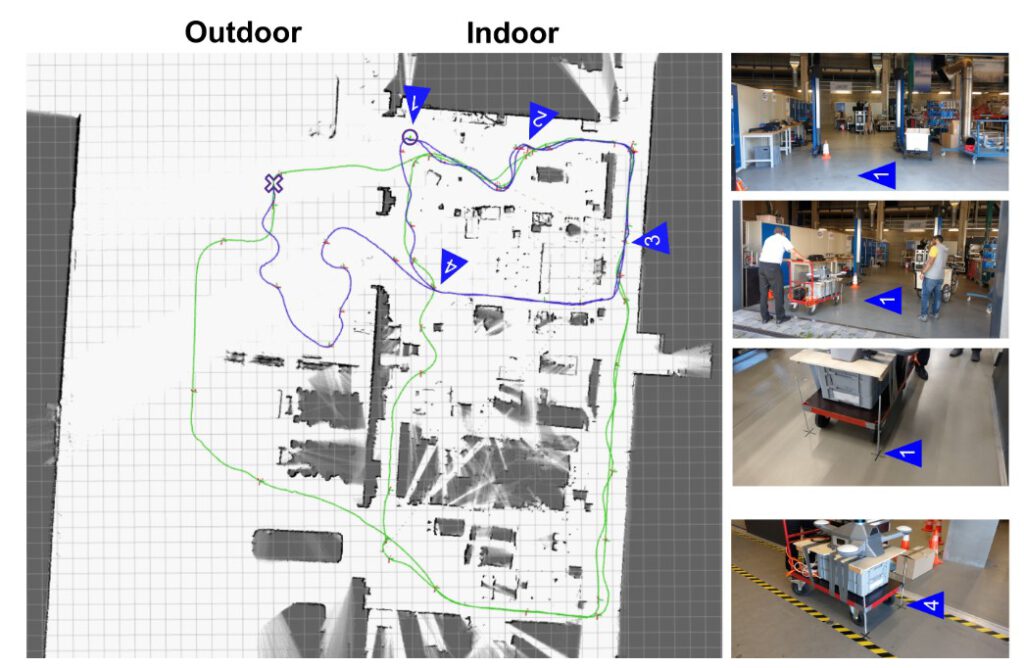 GNSS RTK can provide centimeter-level positioning accuracy outdoors. Short GNSS outages can be overcome with odometry and IMU measurements. LiDAR based SLAM and visual positioning with a camera and a geo-referenced map can support precise positioning outdoors, too. The only need is to have sufficient textures in the close-by environments, which should not be a real limitation for factory premises. Less textures typically means more open sky conditions and, thus, better satellite visibility. Vice versa, less satellite visibility means more obstacles and, thus, more features for visual positioning. Thereby, GNSS and LiDAR/ camera are complementing each other very well. The LiDAR SLAM can provide centimeter-level accuracy for indoor positioning.